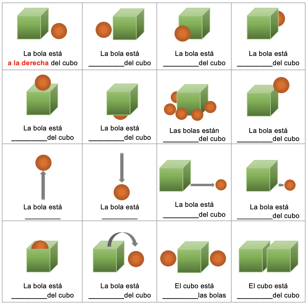 | Encima On | Debajo Under | Cerca Close | Lejos Far | Detrás Behind | Delante In front | Entre Between | Al lado Next to |